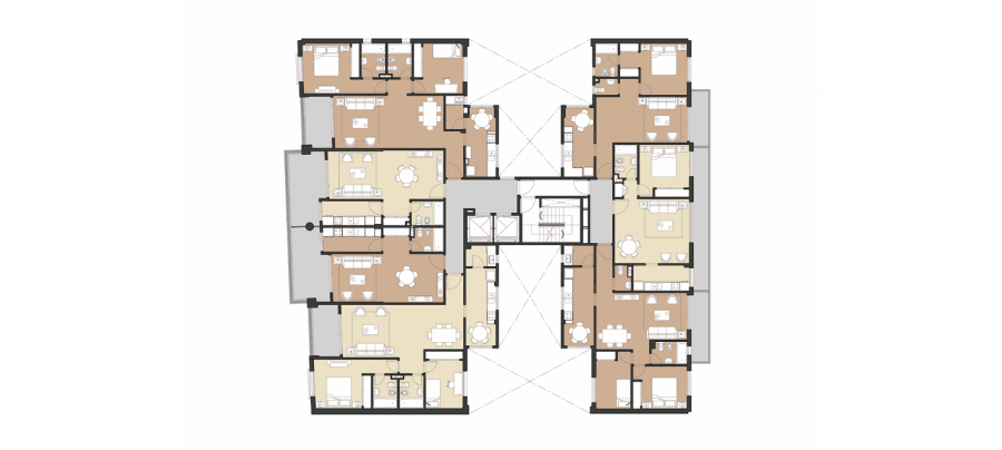 Se desarrolla en dos volúmenes vinculados por el núcleo de servicios. En la Planta Baja se encuentran el hall de acceso a viviendas y acceso independiente al garaje, con varios detalles propios del entorno. Se implemento el uso de molderia metálica en la etapa de HºAº para resolver la ornamentación de la fachada.